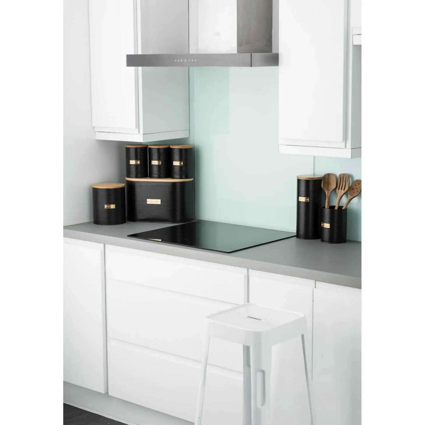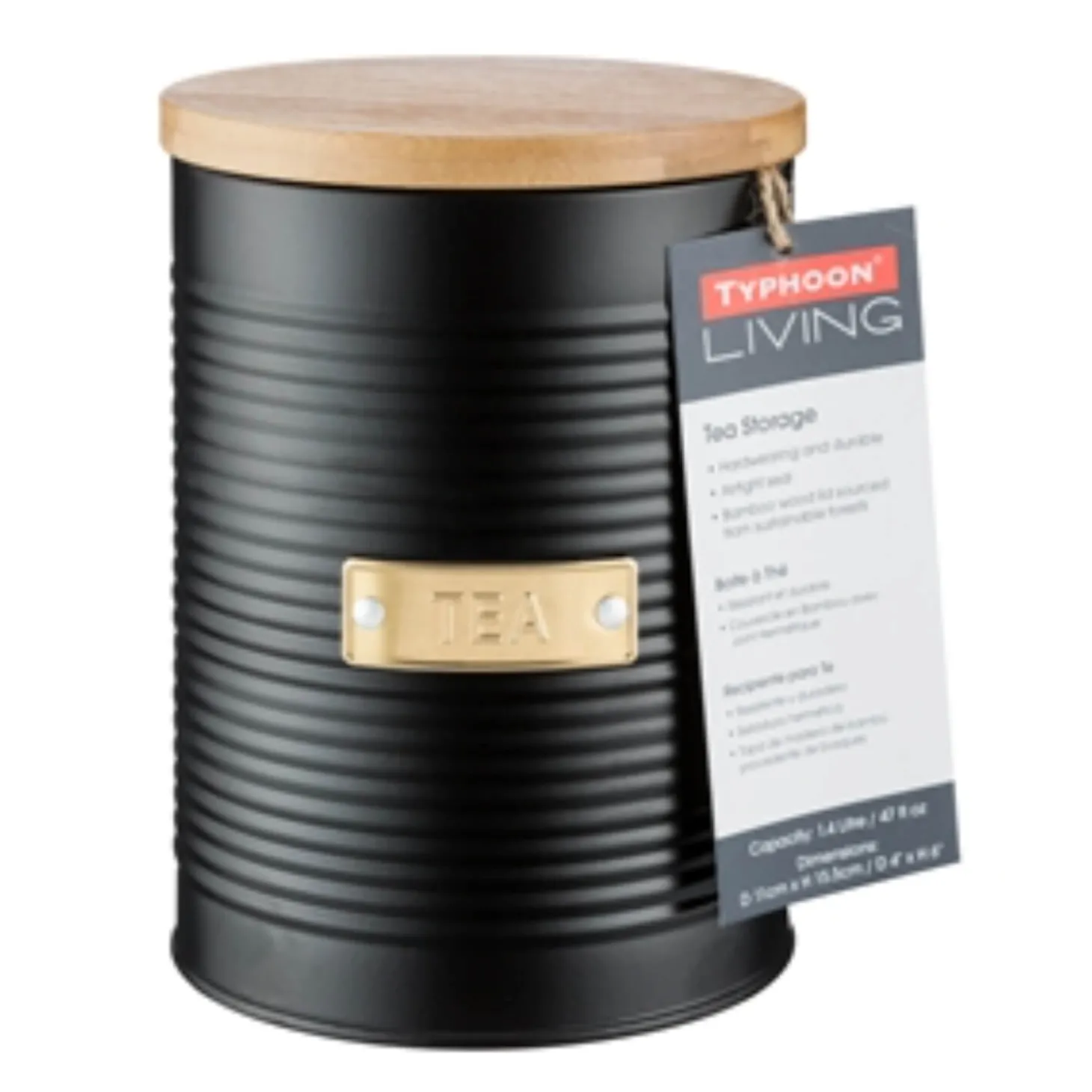 The Typhoon Otto Tea Storage Jar in Black is part of the Typhoon Living Otto collection which features a variety of matte black and gold coloured storage solutions which offer both style and practicality. Each item in the Typhoon Otto range features a black coated seamless steel construction, airtight lids crafted from sustainable bamboo and gold labels.