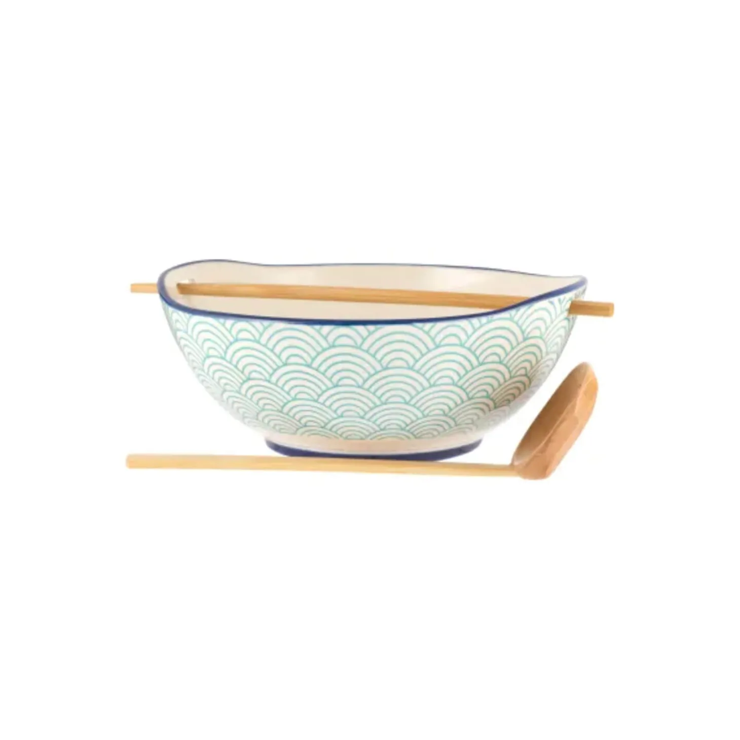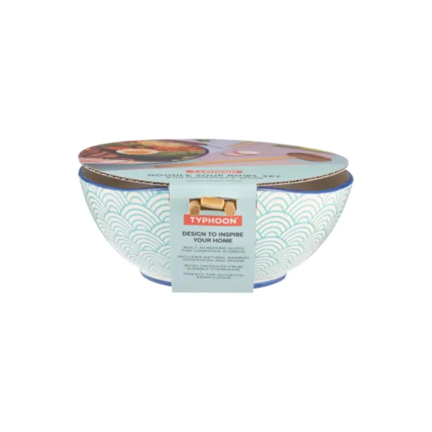 Typhoon presents the Noodle Soup Bowl Set as part of their World Foods range. This bowl is designed for noodle soups like Ramen and Udon. It comes with a bamboo ladle and chopsticks to help pick up the proteins and finish the broth. The bowl is tapered for easy handling. An ideal bowl for lovers of Asian food.