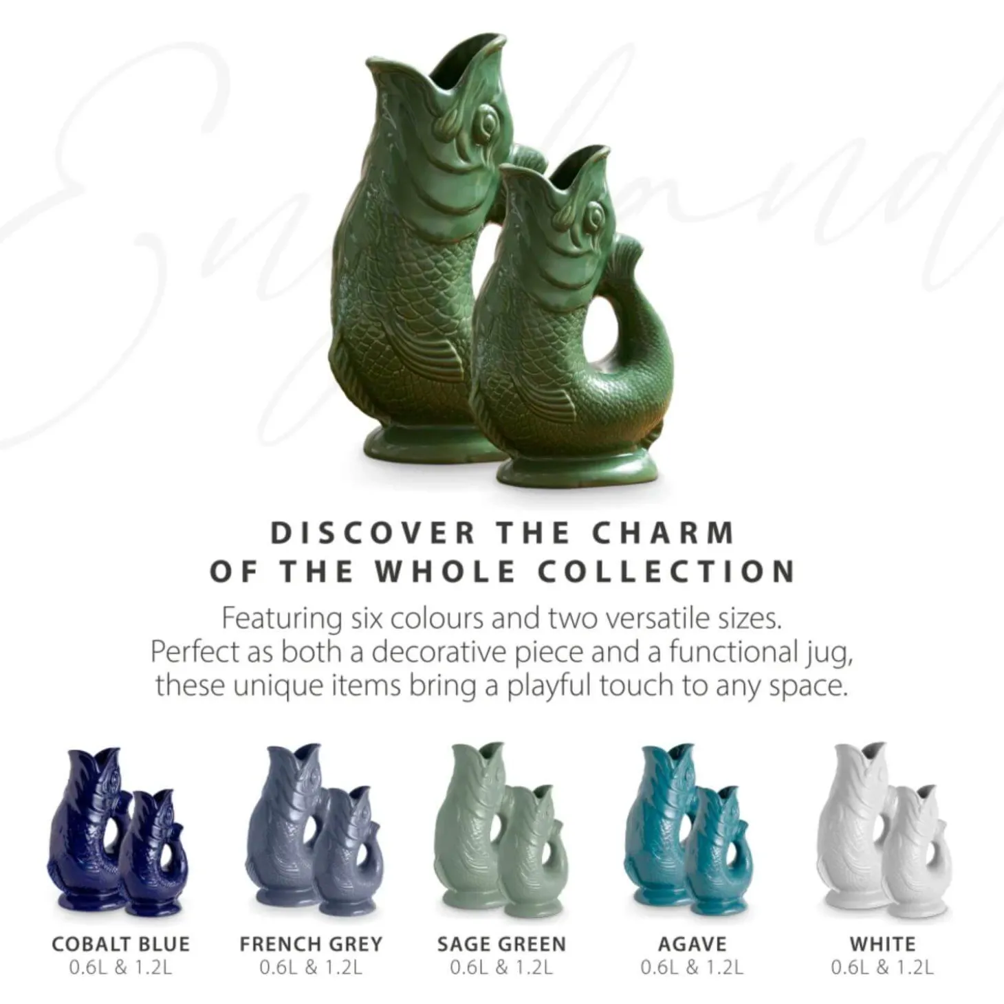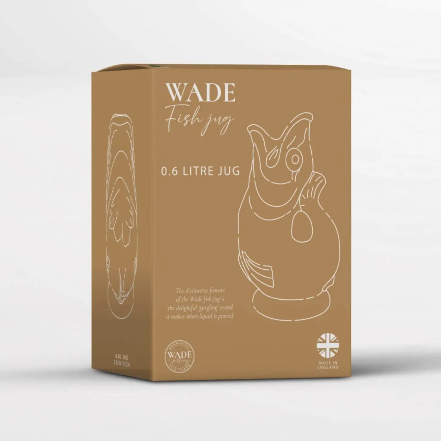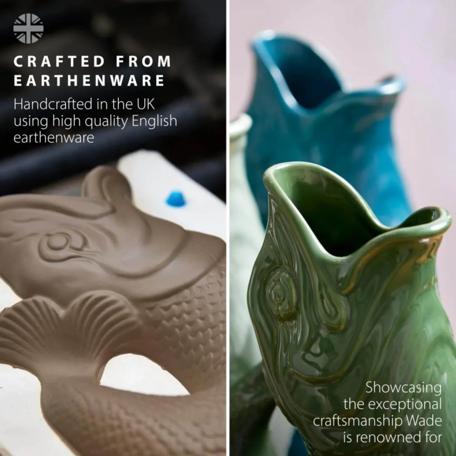 Wade presents the 600ml Fish Gluggle Jug in Forest Green, handcrafted in their potteries in Stoke-on-Trent, where they have been creating beautiful earthenware for over 150 years. This iconic shape has been a fixture in homes since the mid-1800s. Wade uses a traditional slip casting method; the jugs are formed using a plaster mold and, once dried, are fired in their kilns. Each jug is then hand-dipped into a coloured glaze before being placed back into the kiln to achieve the final finish.