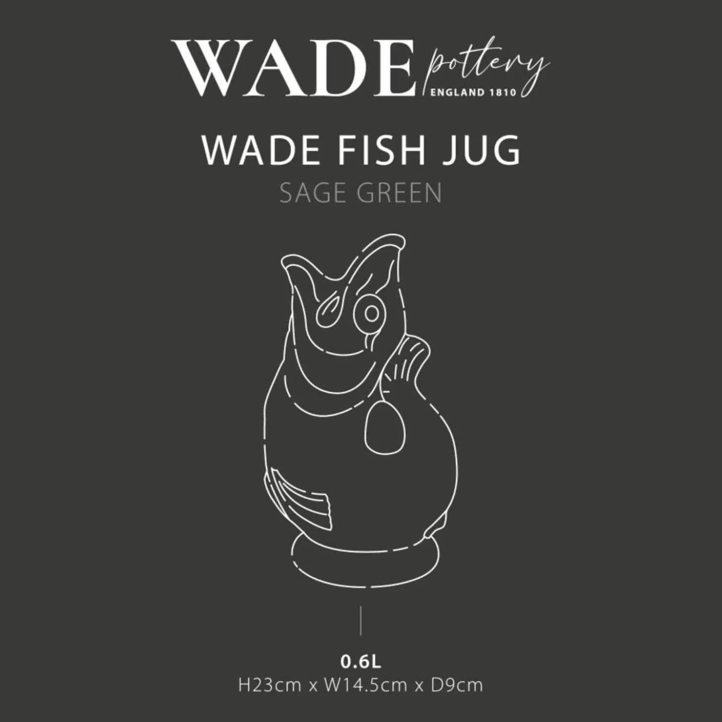 Wade presents the 600ml Fish Gluggle Jug in Sage, handcrafted in their potteries in Stoke-on-Trent, where they have been creating beautiful earthenware for over 150 years. This iconic shape has been a fixture in homes since the mid-1800s. Wade uses a traditional slip casting method; the jugs are formed using a plaster mold and, once dried, are fired in their kilns. Each jug is then hand-dipped into a coloured glaze before being placed back into the kiln to achieve the final finish.