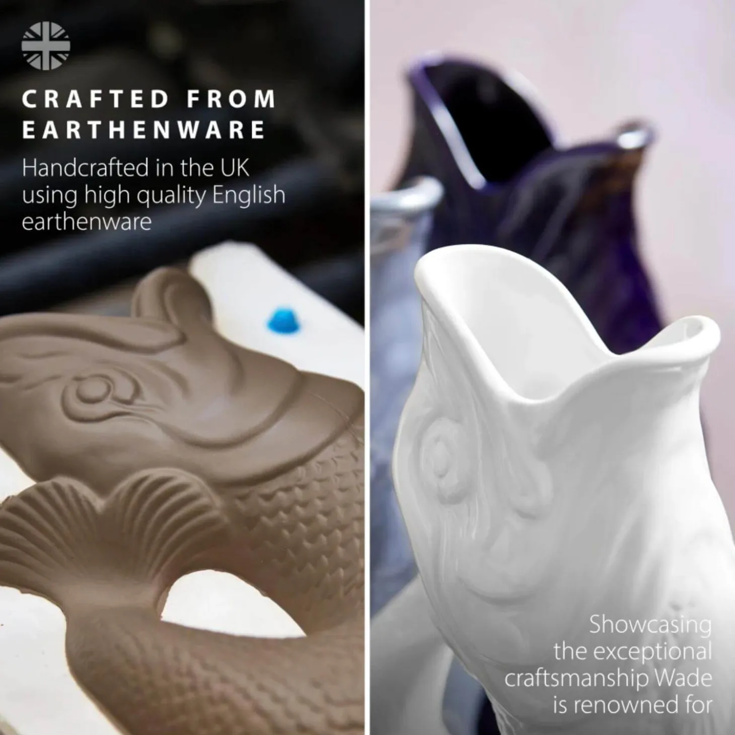 Wade presents the 600ml Fish Gluggle Jug in White, handcrafted in their potteries in Stoke-on-Trent, where they have been creating beautiful earthenware for over 150 years. This iconic shape has been a fixture in homes since the mid-1800s. Wade uses a traditional slip casting method; the jugs are formed using a plaster mold and, once dried, are fired in their kilns. Each jug is then hand-dipped into a coloured glaze before being placed back into the kiln to achieve the final finish.