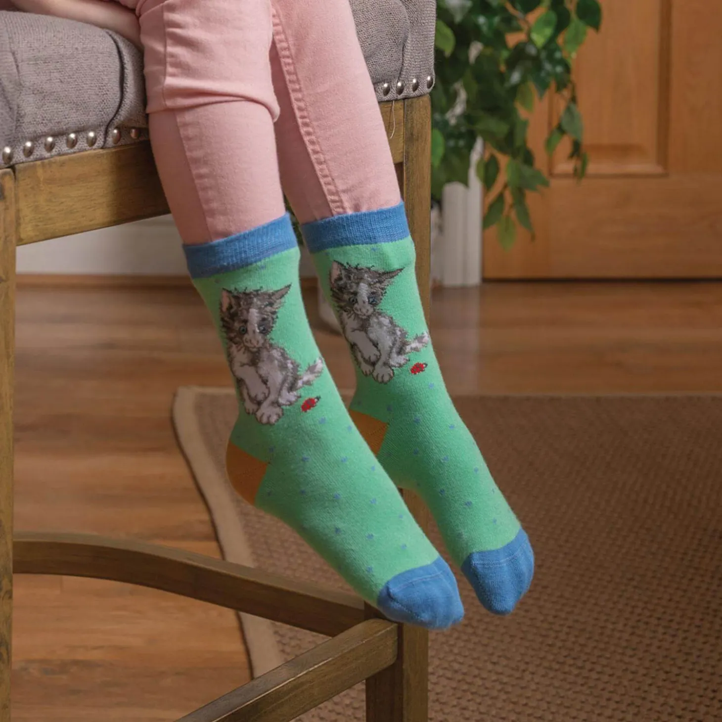 Wrendale Designs presents ‘Ladybird’ Childrens Socks, made from beautifully soft bamboo to keep little toes nice and cosy and warm. Decorated with blue on the toes and tops with a delightful kitten and ladybird on a turquoise blue background. These lovely childrens socks would make a delightful gift.