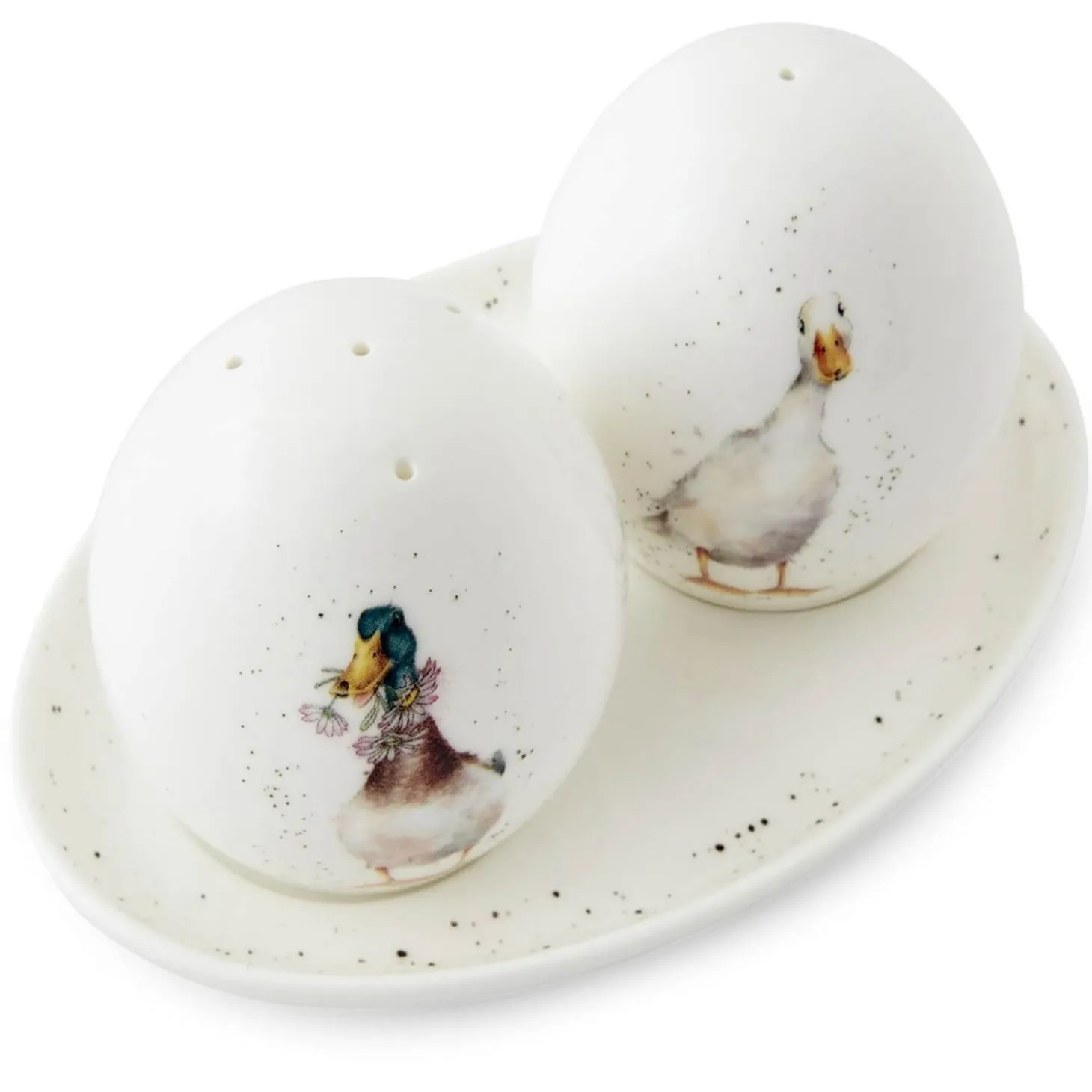 Wrendale Designs presents the Duck Salt & Pepper Pots with Tray, featuring illustrations by renowned artist Hannah Dale. These delightful egg-shaped pots are produced by Royal Worcester and crafted from fine bone china, they feature ducks on a white-speckled background, with one of the ducks holding daisies. These lovely salt & pepper pots would make a wonderful gift or a treat for yourself.