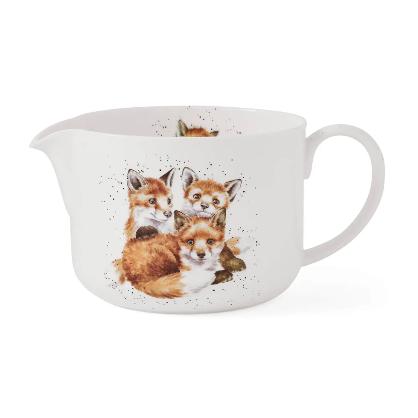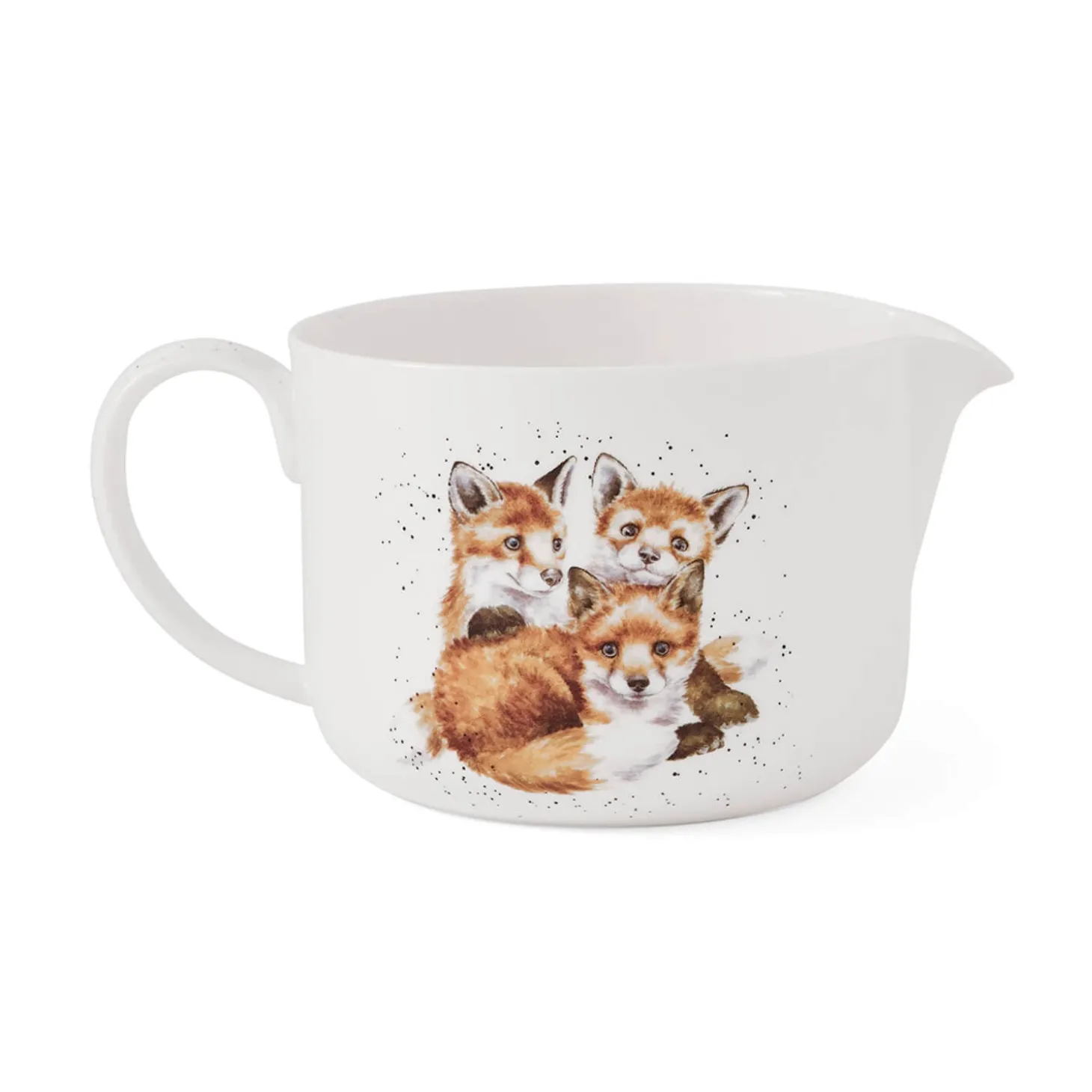 Wrendale Designs presents the 2-litre China Mixing Jug, produced by Royal Worcester and featuring beautiful illustrations by renowned artist Hannah Dale. Practical as well as attractive, this mixing jug features delightful fox cubs on both sides and inside too. This jug has a curved handle and pouring lip for mess-free filling of cake tins. It’s versatile and can be used to mix Yorkshire pudding batter, omelettes, and more.Â