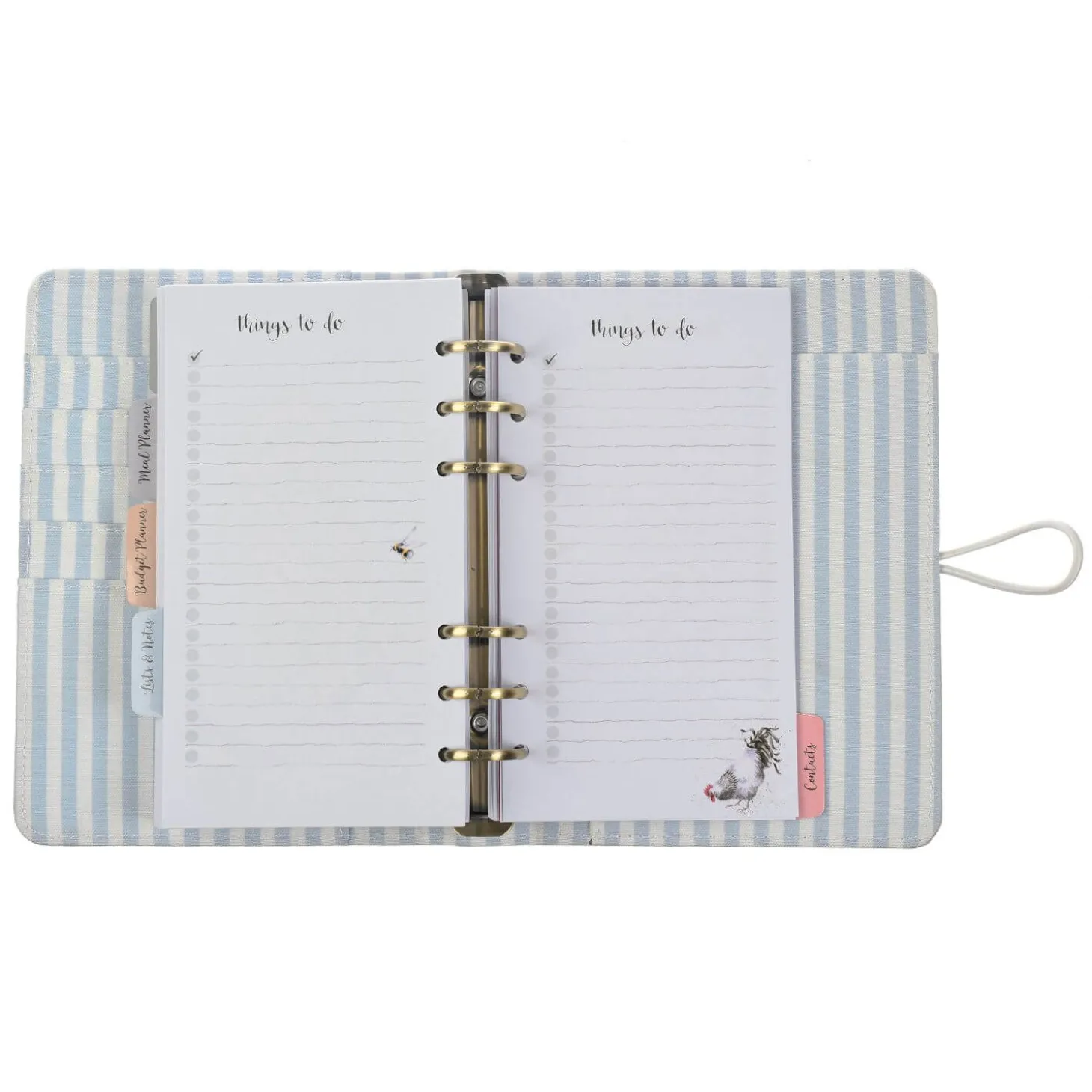 Wrendale Designs present their ‘Hydrangea’ Personal Organiser, featuring illustrations by the renowned artist Hannah Dale. Made from vegan leather in a lovely pale blue showing a delightful bee hovering over a hydrangea flower on the front and back of the organiser, inside you will find everything you need to organise your routine with weekly and monthly planners, a meal planner plus to do and shopping lists, pages for contacts, passwords and budgets. On the front of the personal organiser is a wren stud to enable you to keep it closed with the elastic band attached to the back, the interior is canvas and striped in a complementing colour with pockets to hold notes and receipts. All the pages can be moved around on the brushed brass 6 ring loose-leaf binder to an order that suits you. This beautiful organiser would make a lovely gift or a treat for yourself.
