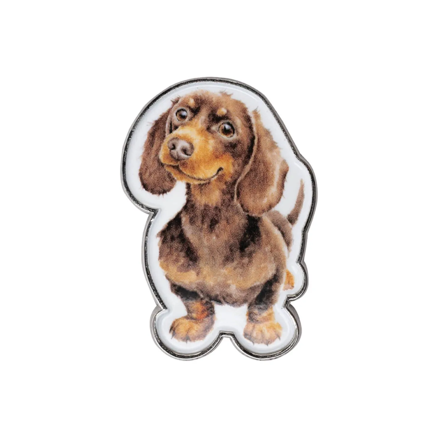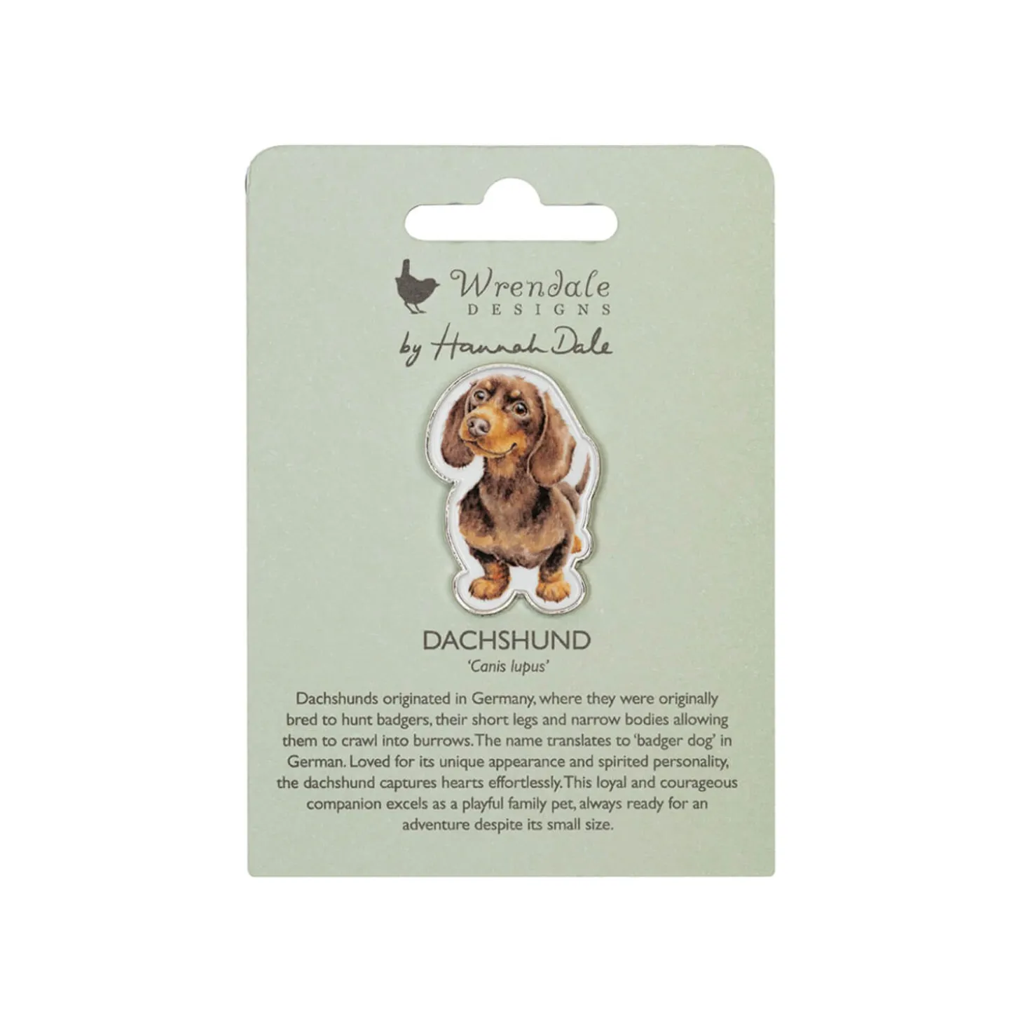 Wrendale Designs presents the ‘Little Sausage’ Dog Pin Badge, featuring illustrations by renowned artist Hannah Dale of an adorable little dachshund, happy and content. This delightful pin, cast in durable alloy with a sleek silver finish is perfect for adding a touch of countryside charm to any outfit, bag or accessory. A wonderful gift for nature lovers and Wrendale collectors alike.