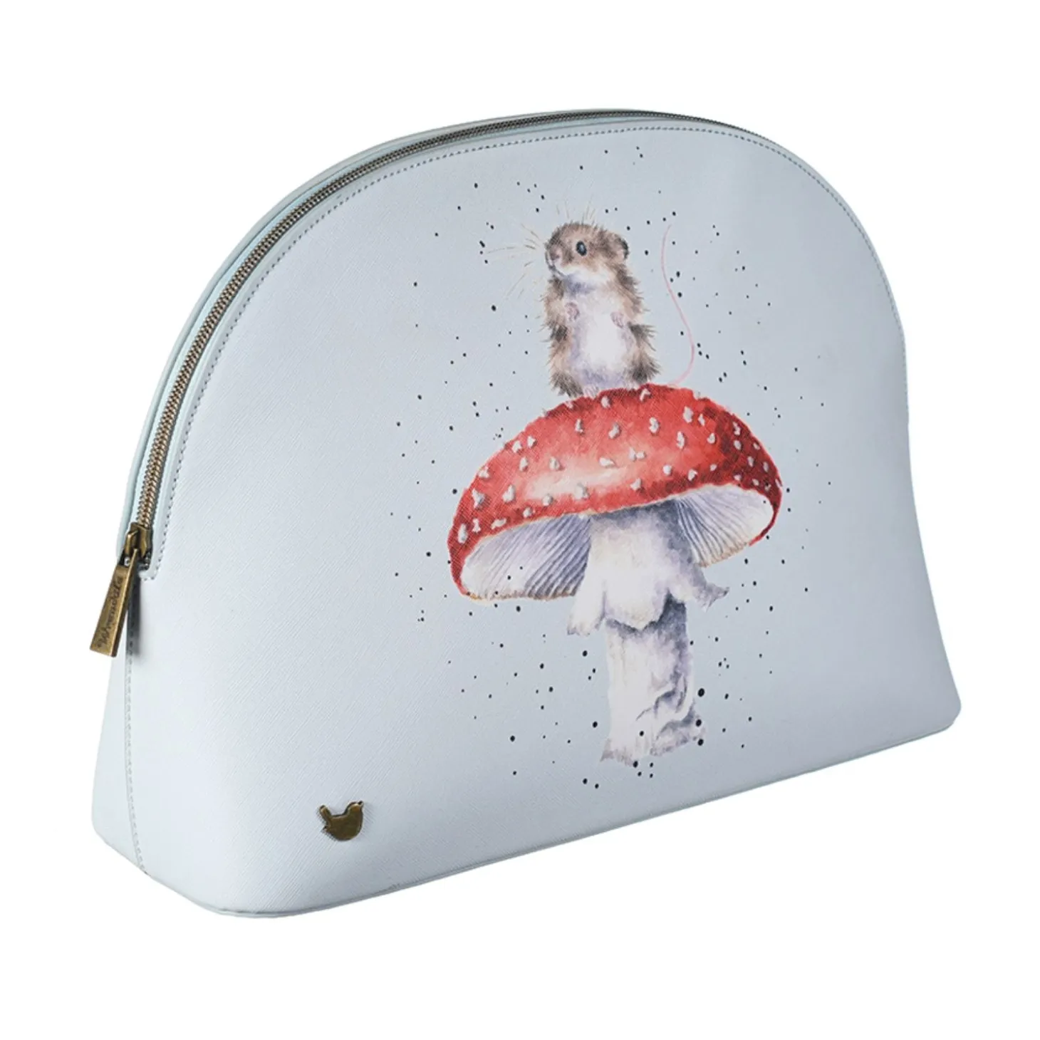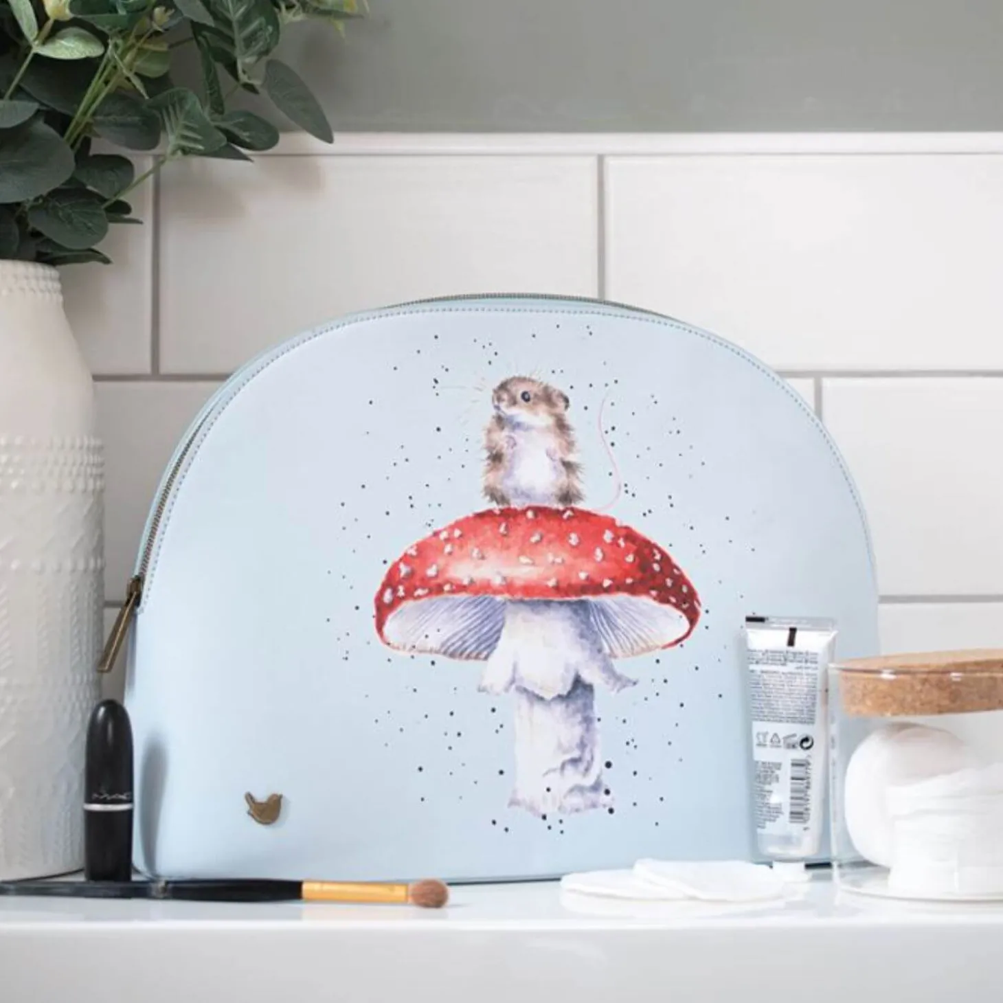 Wrendale Designs presents their ‘He’s A Fun-Gi’ Large Cosmetic Bag that will contain all your make-up, brushes and much more. Made of vegan leather this cosmetic bag has a branded zip-top fastening and features the wren stud made of antique brass, the illustration by the renowned artist Hannah Dale features a delightful mouse atop a toadstool on a pale blue background. This lovely cosmetic bag would make a lovely gift or a treat for yourself. Other designs and sizes are available.