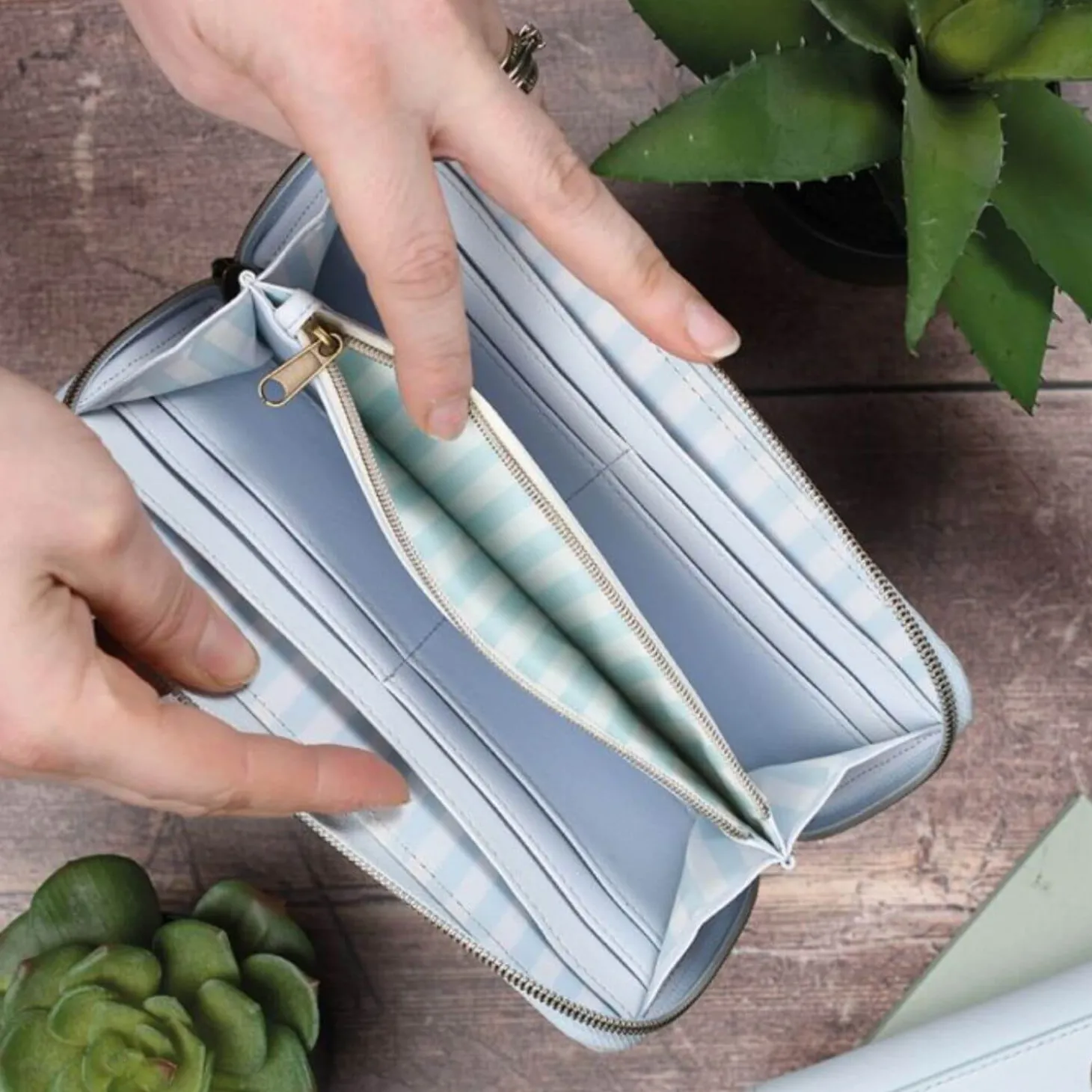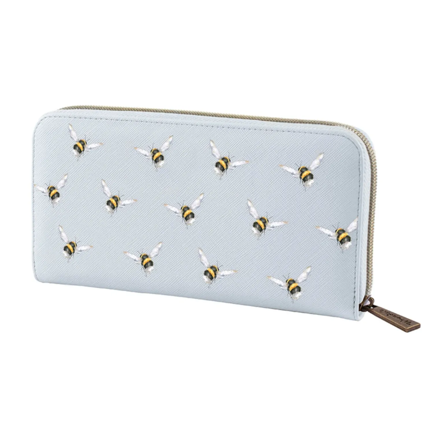 Wrendale Designs presents their ‘Flight Of The Bumbebee’ Large Purse, featuring illustrations by the renowned artist Hannah Dale. Made from vegan leather, this lovely purse shows illustrations of lots of bees on the reverse side and on the front is a wren stud with another illustration of a bee on a pale blue background. The interior has many compartments to keep your loose change, notes, cards and receipts safe and features a contrasting striped lining. This purse complements bags, scarves and other products in the Wrendale range, making it an ideal gift or a treat for yourself.