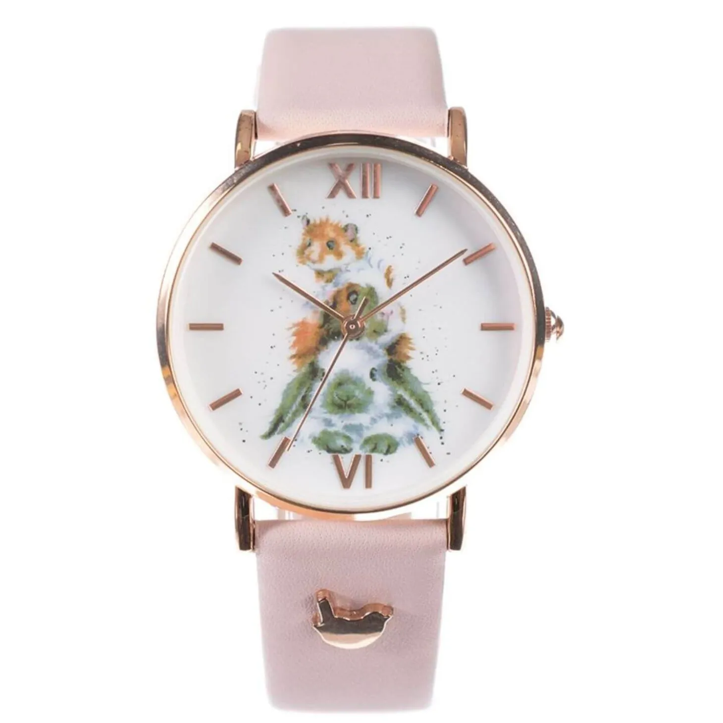 Wrendale Designs presents the Piggy In The Middle Watch. This beautiful watch with a pale pink leather strap features a silver wren and another on the buckle, it has an illustration by Hannah Dale of three cute guinea pigs on the watch face. The watch comes in a gift box with a matching illustration wrap. This watch will make an ideal gift or you may wish to treat yourself!