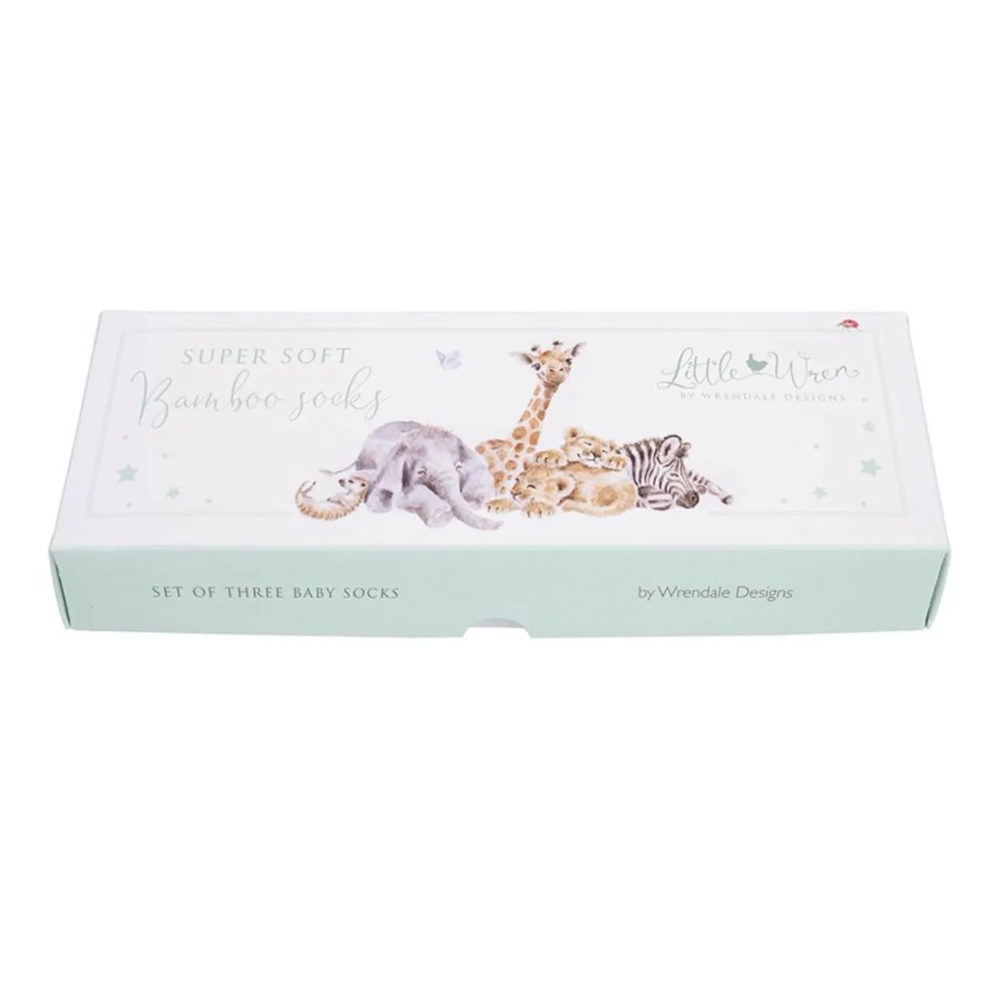 Wrendale Designs presents ‘Little Savannah African Animal’ Little Wren Baby Socks, made from beautifully soft bamboo to keep little toes nice and cosy and warm. Decorated with pale green on the toes, heels and tops and featuring a lion cub, baby zebra and giraffe with the wren branding logo underneath, packaged in an illustrated plastic-free box. This pack of three 0-6 months old baby socks would make a delightful gift.