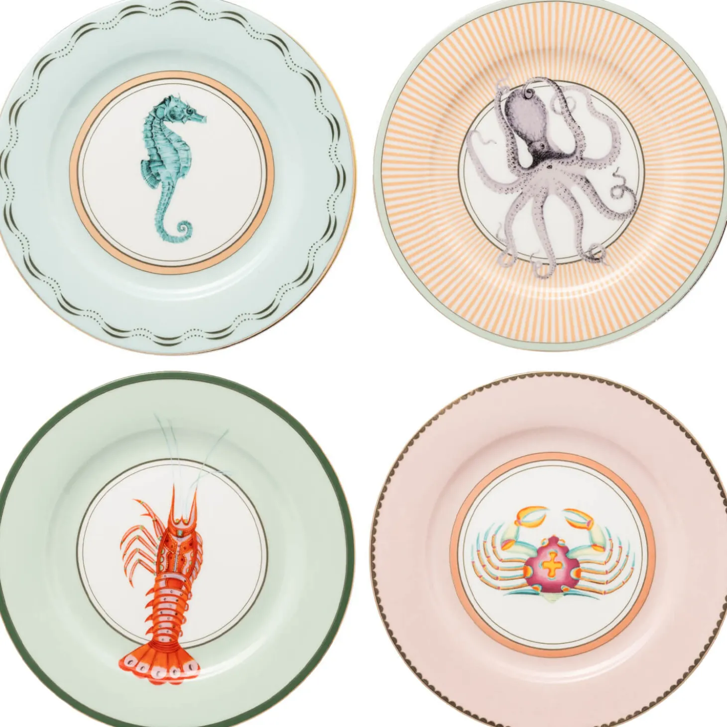 Yvonne Ellen presents the 4-Piece Fine China Side Plates in Under The Sea design. Yvonne Ellen, a British designer, brings a touch of elegance and charm to her products each telling a whimsical tale using animal characters and playful slogans. Beautifully made with gold detailing and designed to make you smile, these plates are sure to add a touch of fun and sophistication to your table.