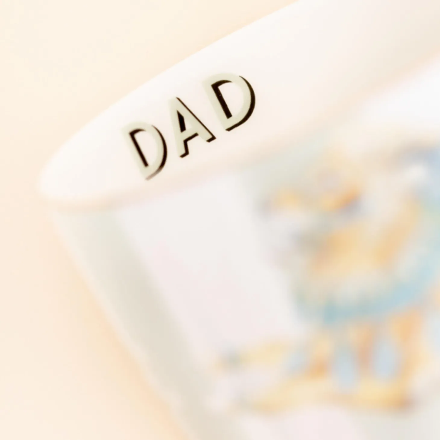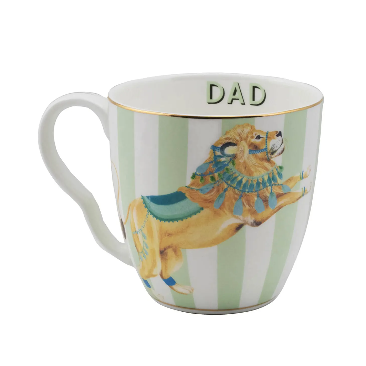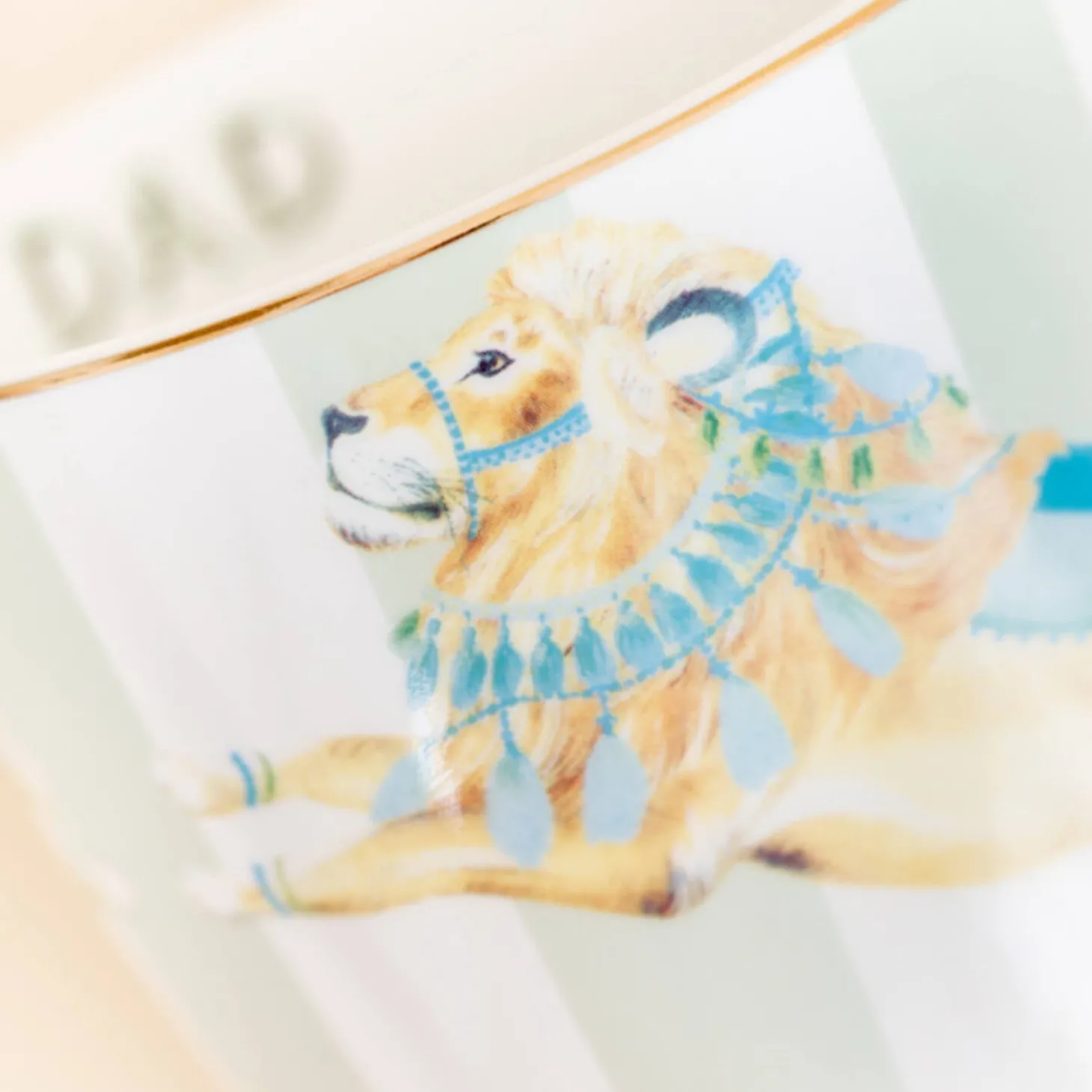 Yvonne Ellen presents the Large Bone China Mug in Dad design. Yvonne Ellen, a British designer, brings a touch of elegance and charm to her bone china mugs, each telling a whimsical tale using animal characters and playful slogans. This mug is delightfully decorated with mint green stripes beneath a magnificent lion and stunning gold accent details. The ‘Dad’ slogan appears on the inside rim. An ideal gift to celebrate your much loved Dad.