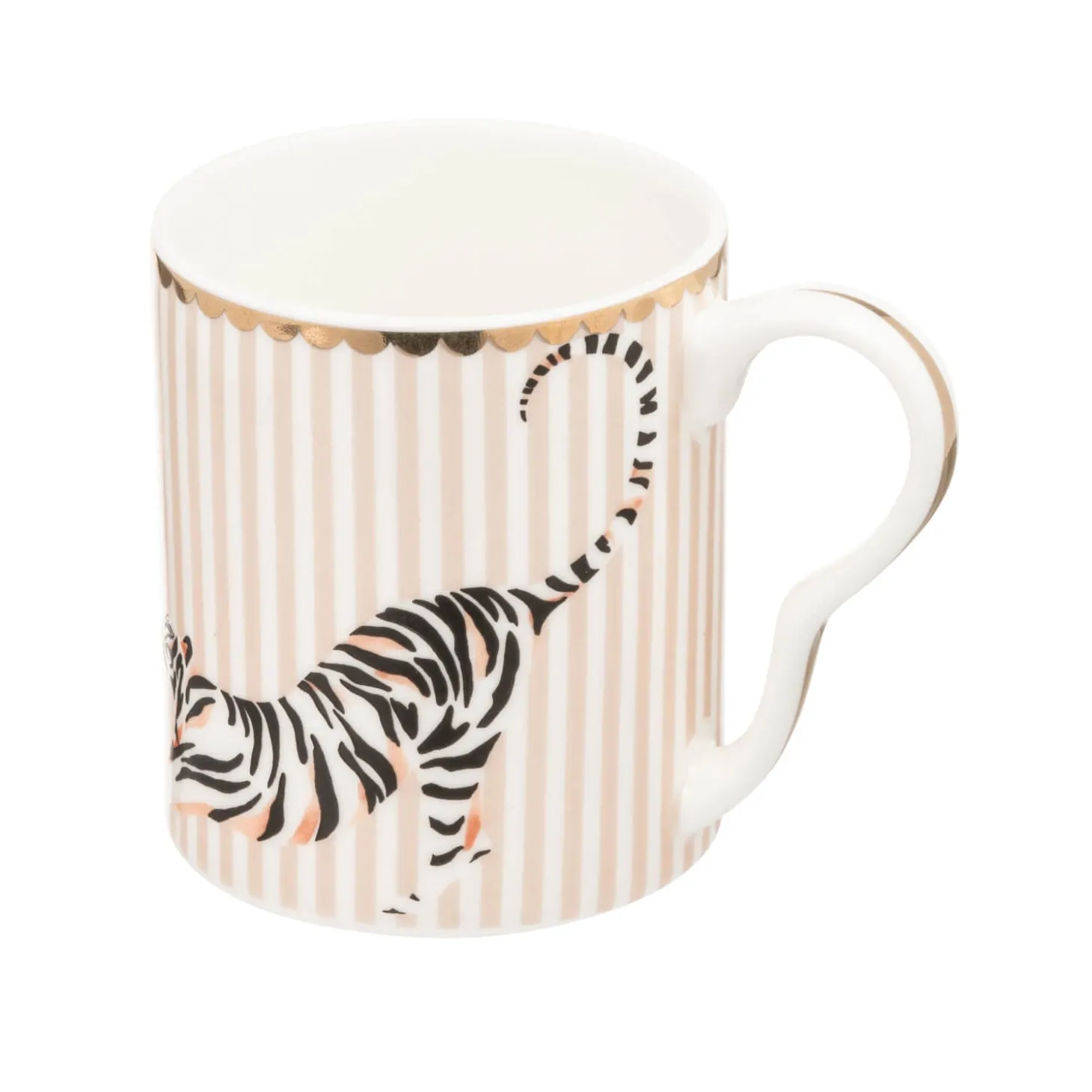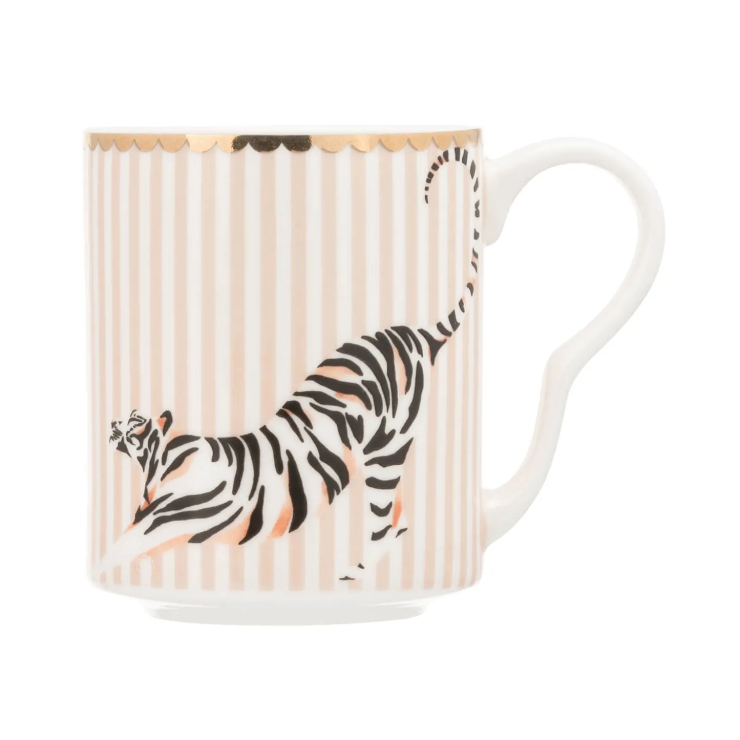 Yvonne Ellen presents the Small Bone China Mug in Tiger design. Yvonne Ellen, a British designer, brings a touch of elegance and charm to her bone china mugs with each telling a whimsical tale using animal characters and playful slogans. This mug is delightfully decorated with a delightful tiger on a soft pink and white striped background, finished with stunning gold trimming. A wonderful gift for your animal loving friend.