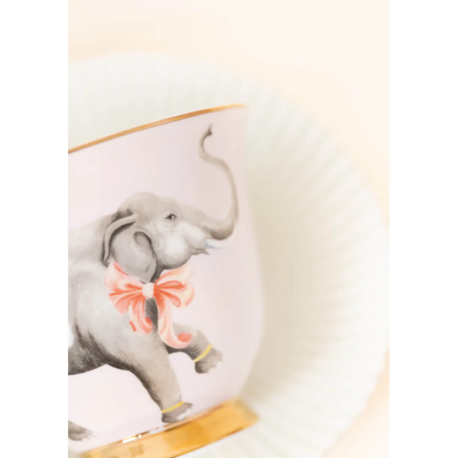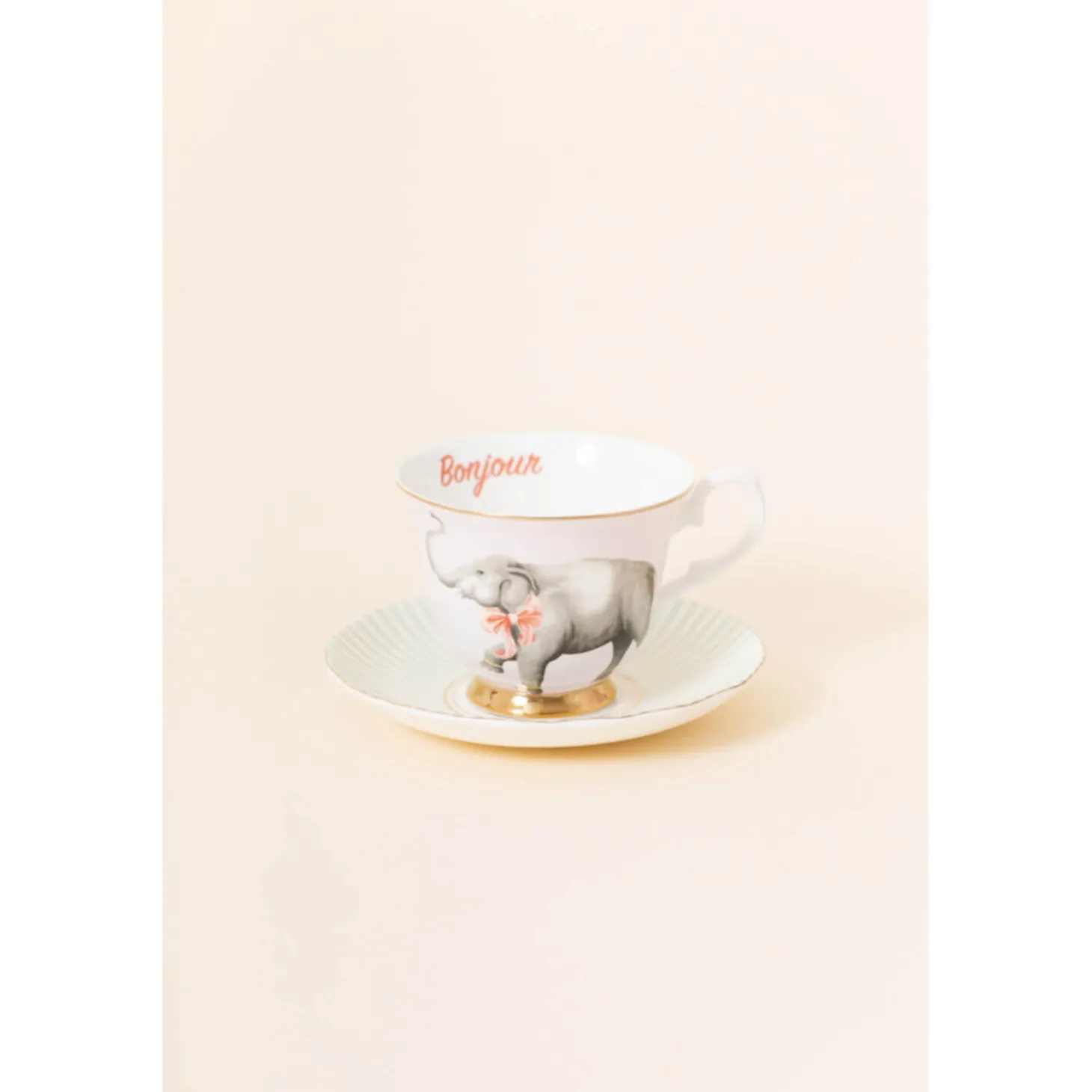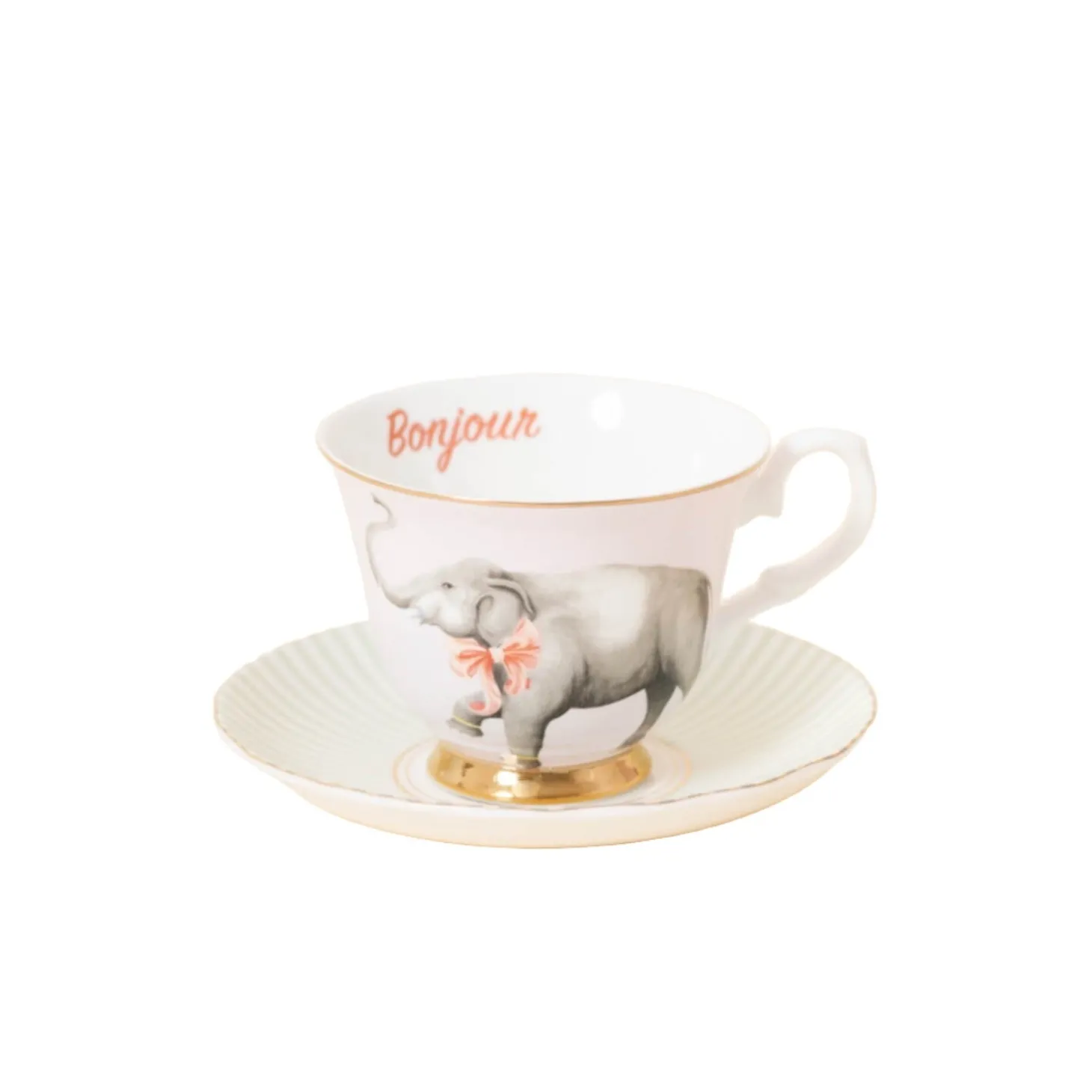 Yvonne Ellen presents the Fine China Teacup & Saucer in Elephant design. Yvonne Ellen, a British designer, brings a touch of elegance and charm to her products each telling a whimsical tale using animal characters and playful slogans. Beautifully made with gold detailing and designed to make you smile, this cup and saucer is sure to add a touch of fun to your much needed cup of tea.