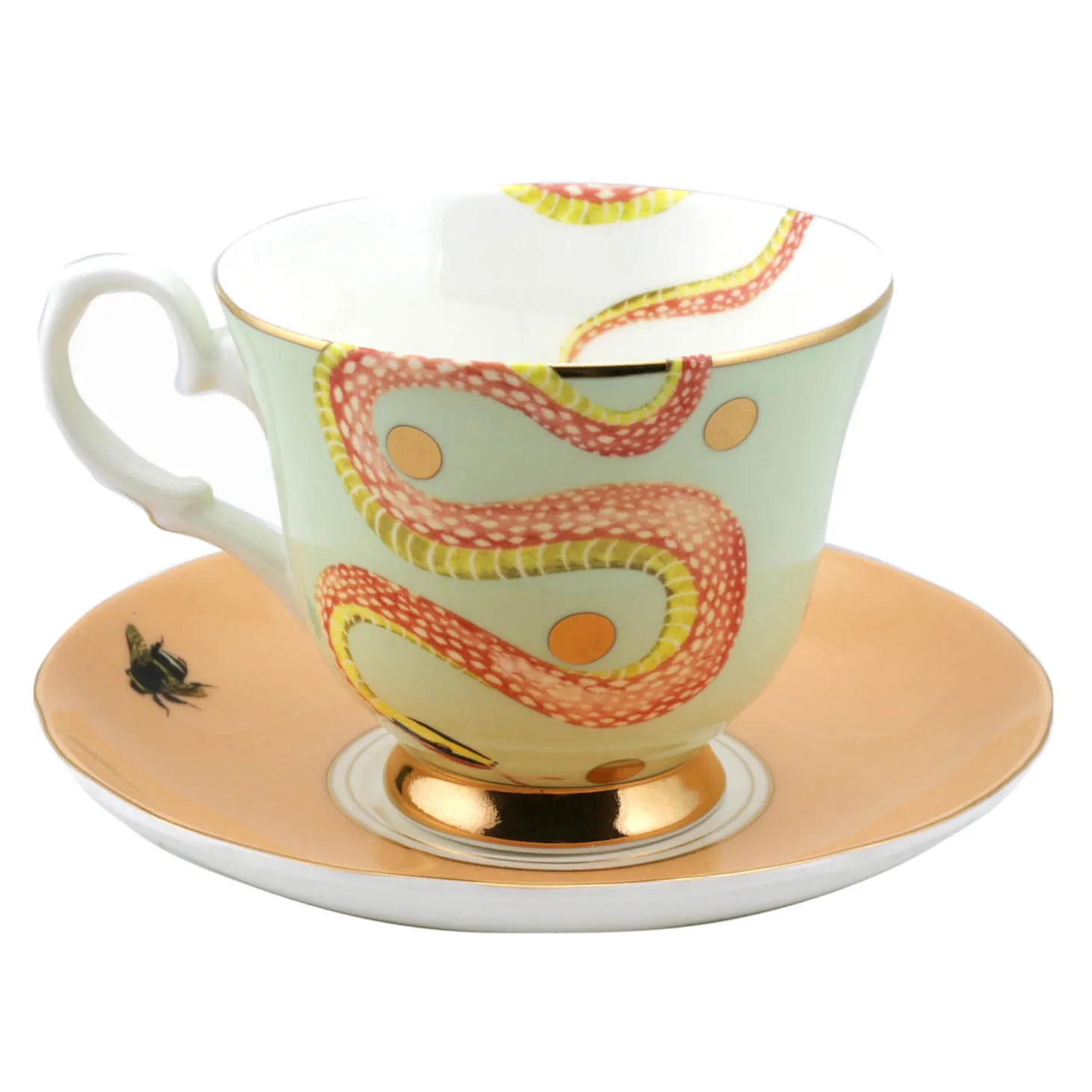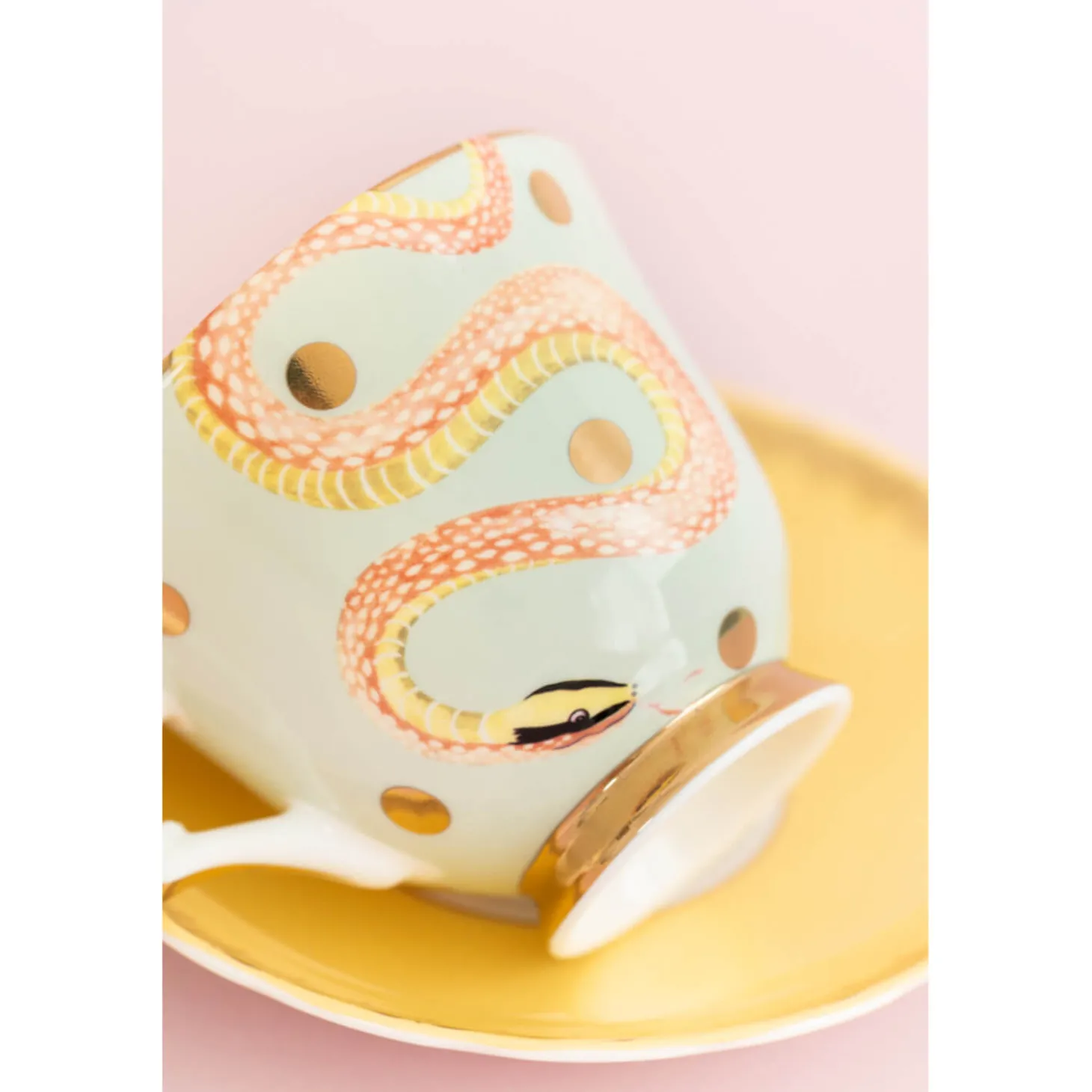 Yvonne Ellen presents the Fine China Teacup & Saucer in Snakey design. Yvonne Ellen, a British designer, brings a touch of elegance and charm to her products each telling a whimsical tale using animal characters and playful slogans. Beautifully made with gold detailing and designed to make you smile, this cup and saucer is sure to add a touch of fun to your much needed cup of tea.