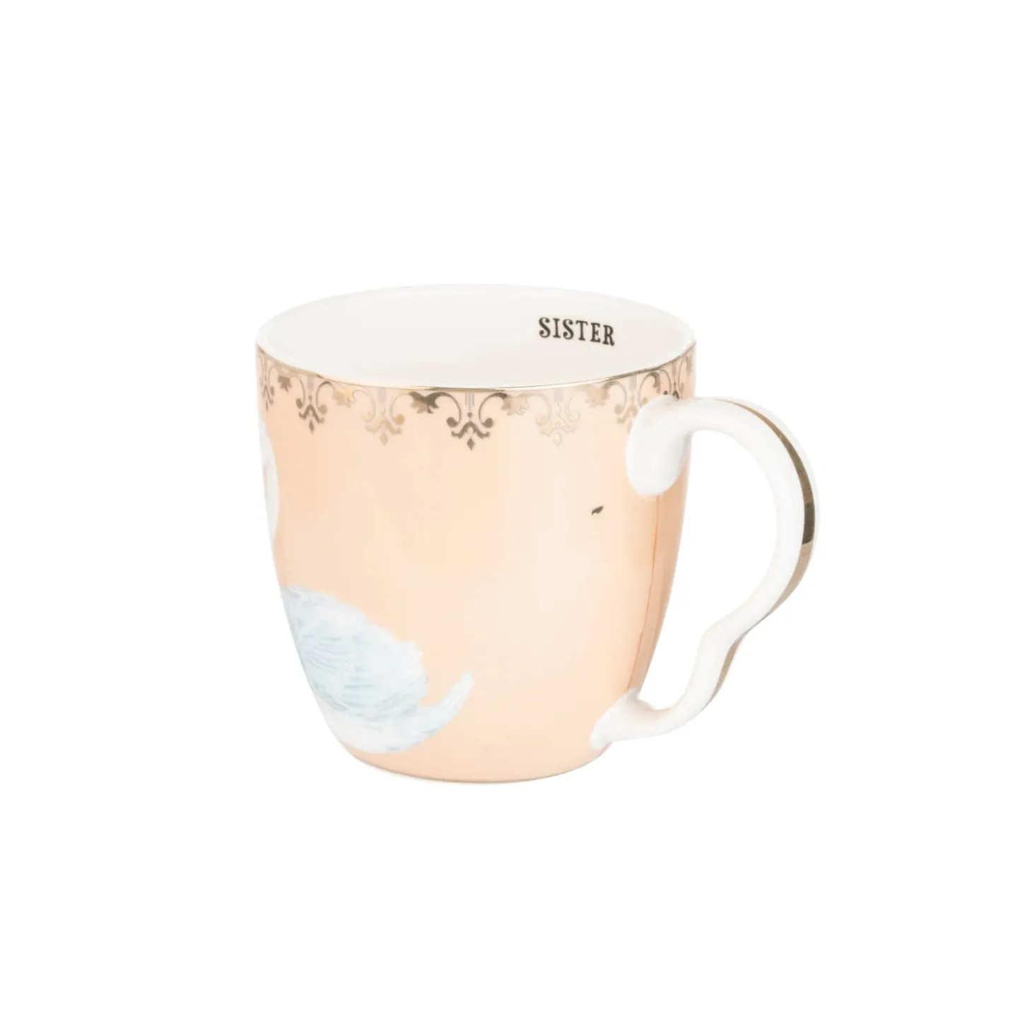 Yvonne Ellen presents the Large Mug in Sister design. Yvonne Ellen, a British designer, brings a touch of elegance and charm to her bone china mugs with each telling a whimsical tale using animal characters and playful slogans. Each piece is tastefully decorated with colourful charm and royal-style gold accents. A lovely, cheerful way to add a touch of elegance to your home.