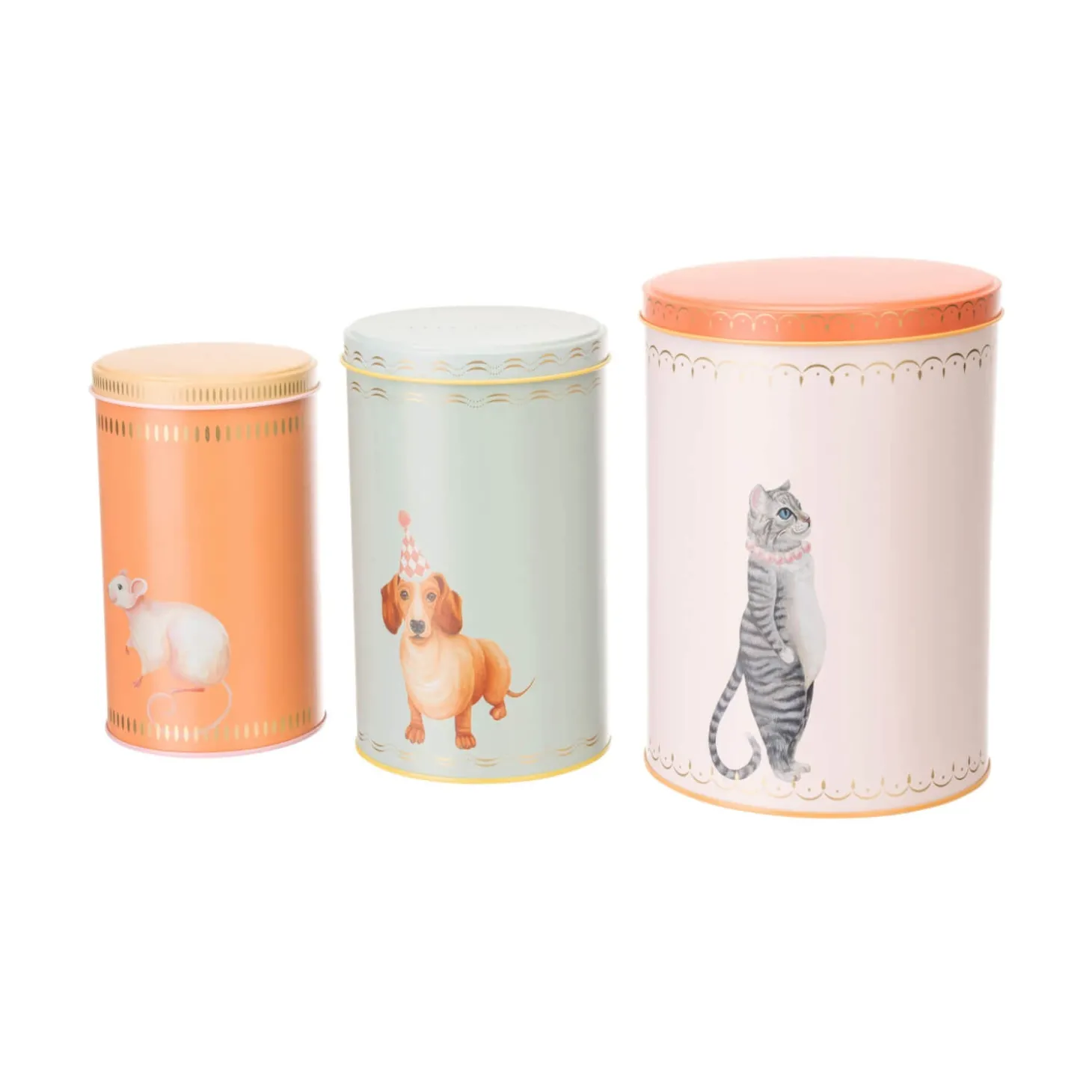 Yvonne Ellen presents the Set of 3 Storage Tins in Sausage Doggie, Mousey & Pussy design. Yvonne Ellen, a British designer, brings a touch of elegance and charm to her products, each telling a whimsical tale using animal characters and playful slogans. Beautifully made and designed to make you smile, these delightful storage tins are sure to brighten up your home.Â