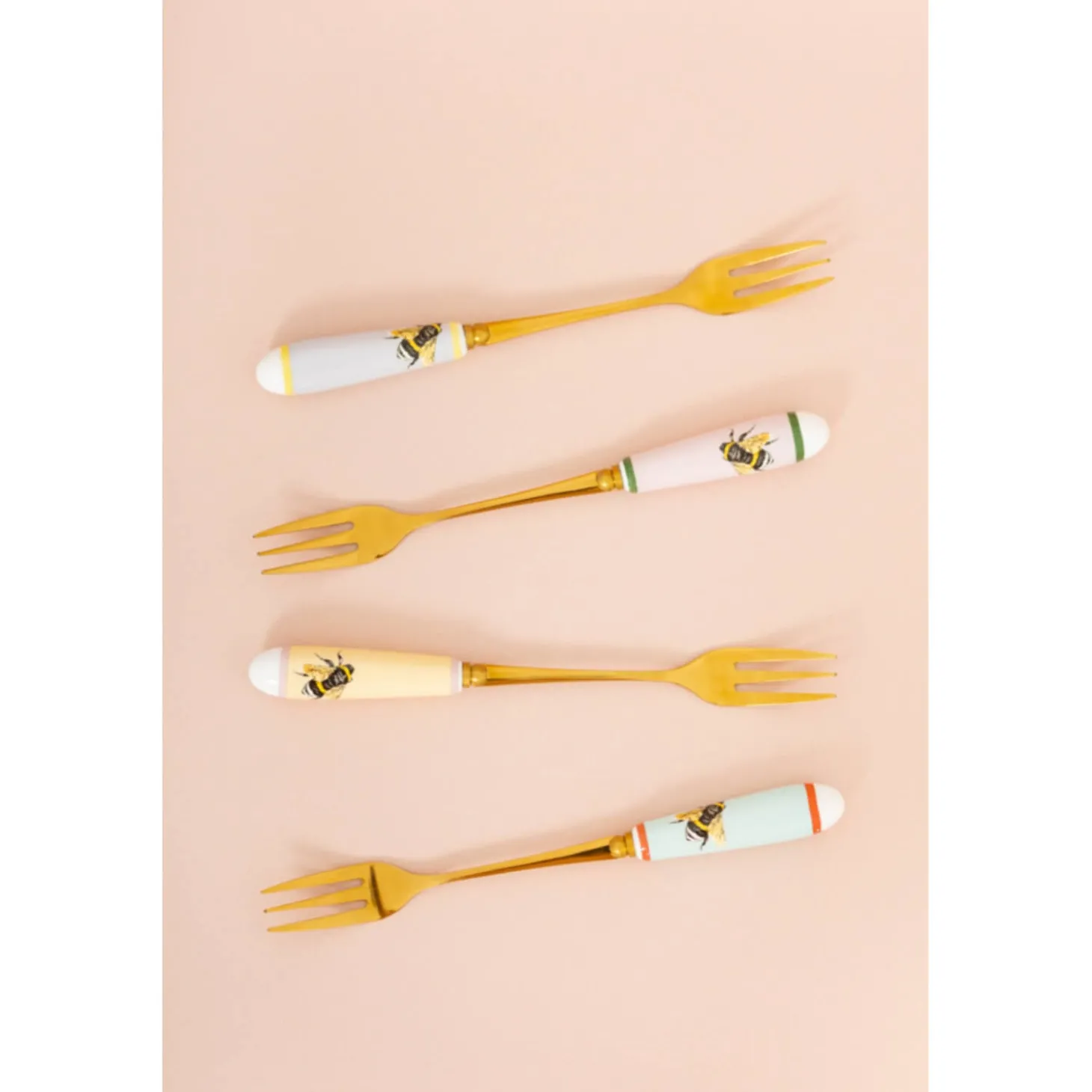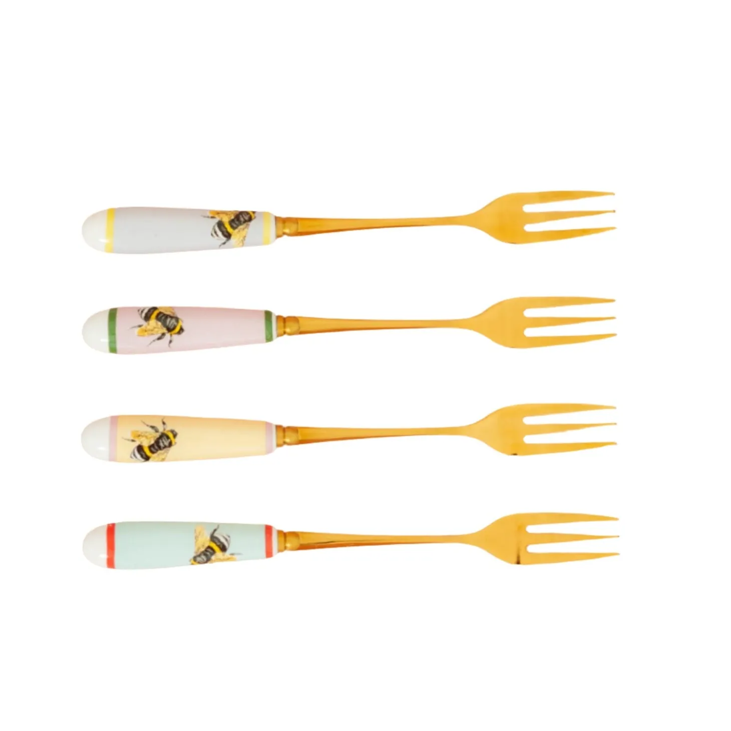 Yvonne Ellen presents the Set of 4 Cake Forks With China Handles in Bee design. Yvonne Ellen, a British designer, brings a touch of elegance and charm to her products each telling a whimsical tale using animal characters and playful slogans. Beautifully made and designed to make you smile, these forks are sure to add a touch of fun to your kitchen.