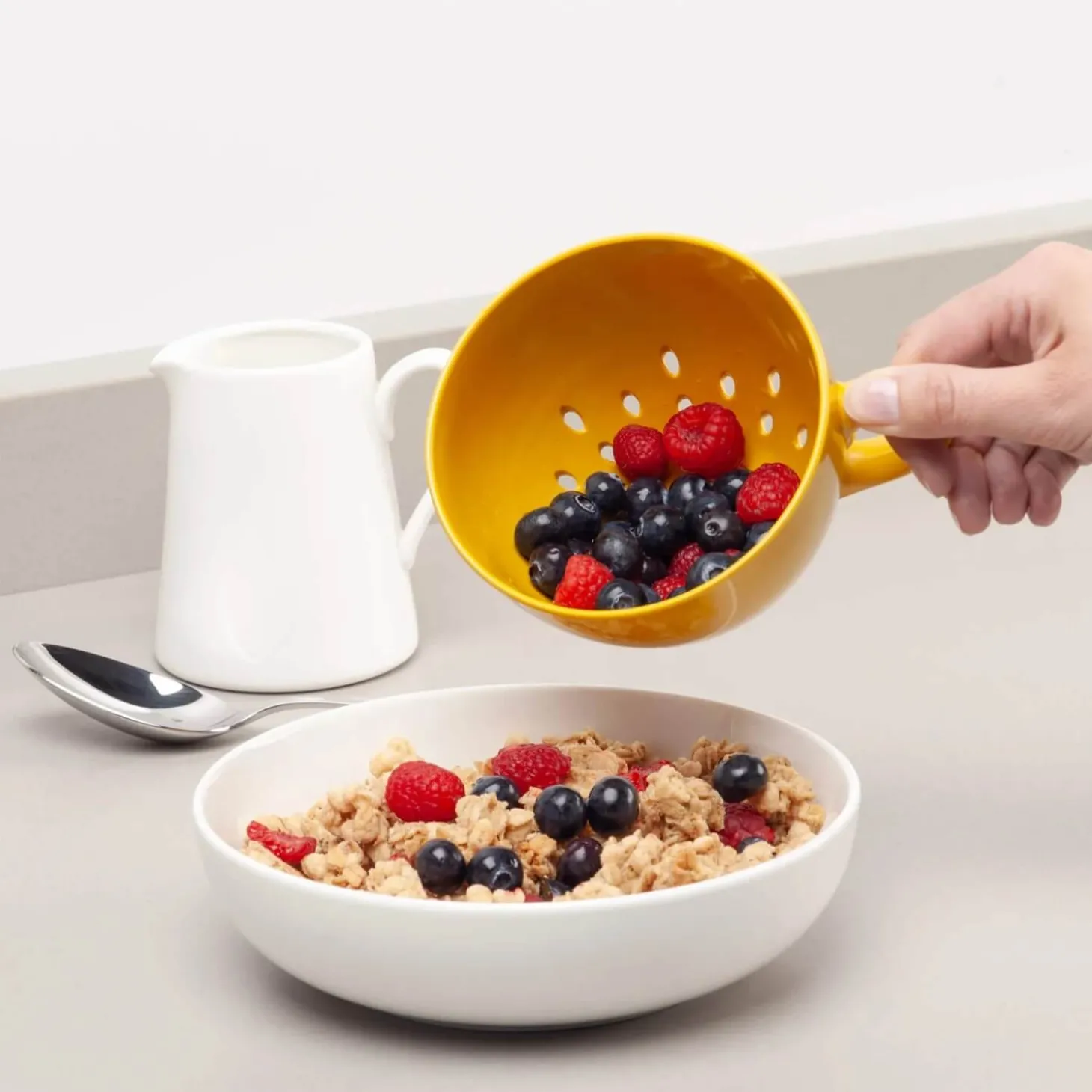 Zeal presents the Berry Colander in Mustard, this delightful little colander is about the size of a large teacup with a handle on the side, ideal for draining or rinsing small amounts, like fruit, peas and more. Small, but strong and sturdy, this Berry colander will sit securely in your sink or on your countertop.