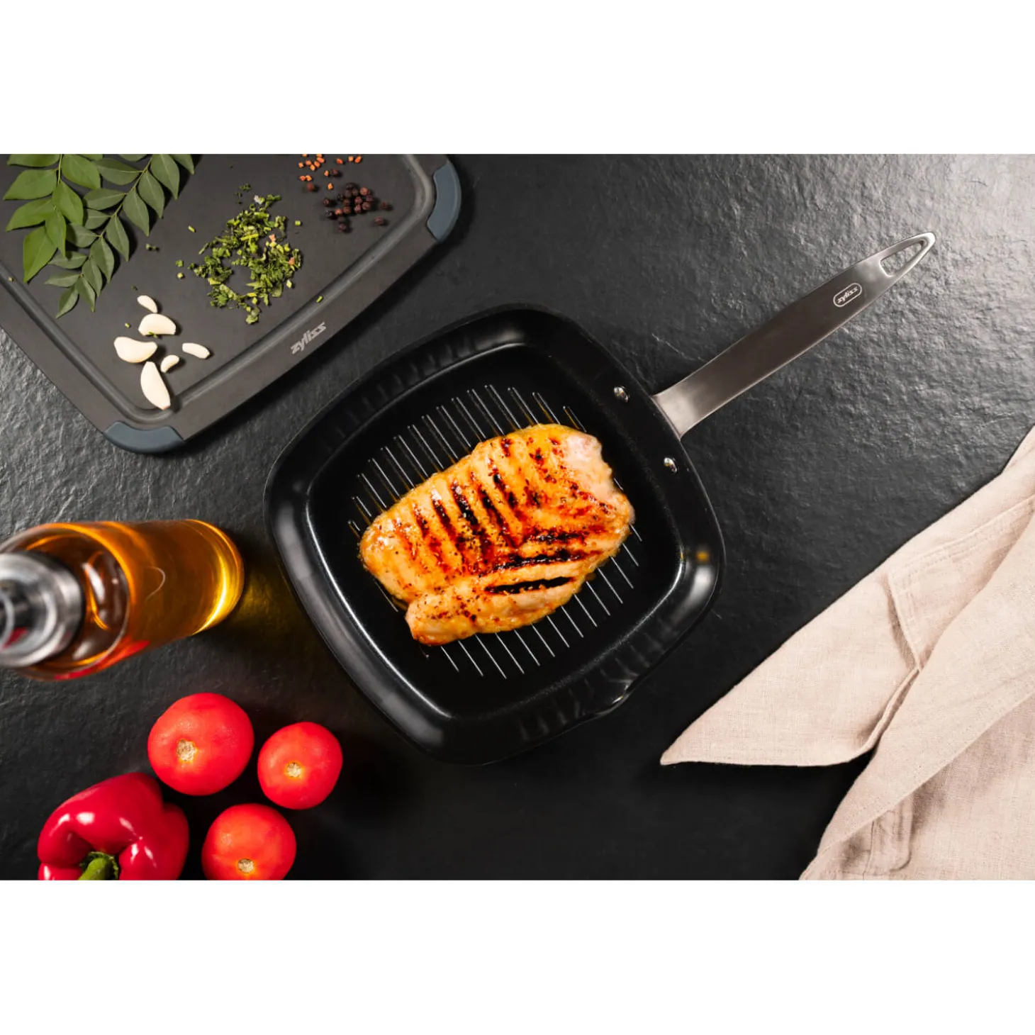Zyliss presents the Ultimate Pro Ceramic Non-Stick 26cm Square Grill Pan, featuring their toughest ever non-stick ceramic coating, offering exceptional durability, easy food release, and quick clean-up. Made with eco-friendly recycled aluminium and a stainless steel base, it provides fast, even heating on all hob types, including induction. Designed for convenience, it features a pouring spout and is safe for metal utensils and dishwashers. The perfect pan for busy kitchens.